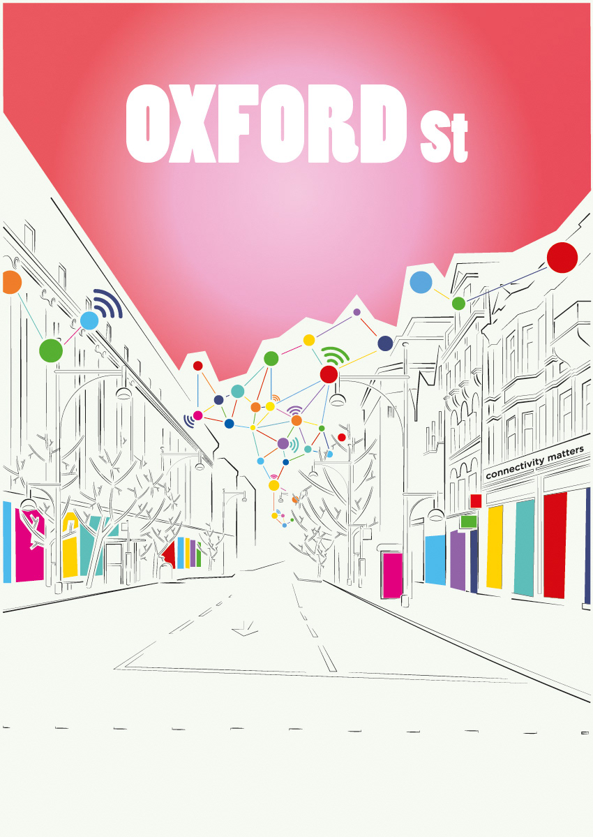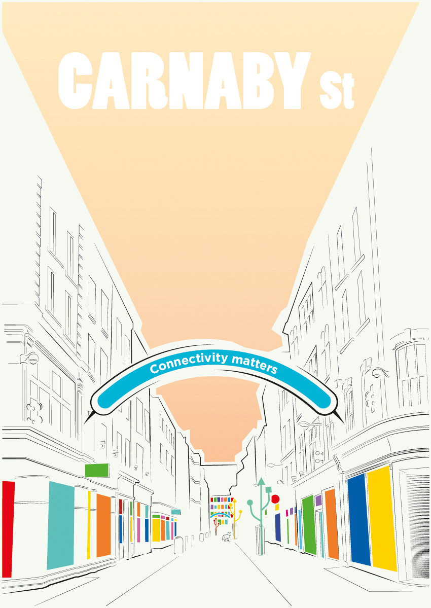 Following on from a poster series designed for the Paris office, the client wanted a small series depicting shopping streets of London with a technological twist.